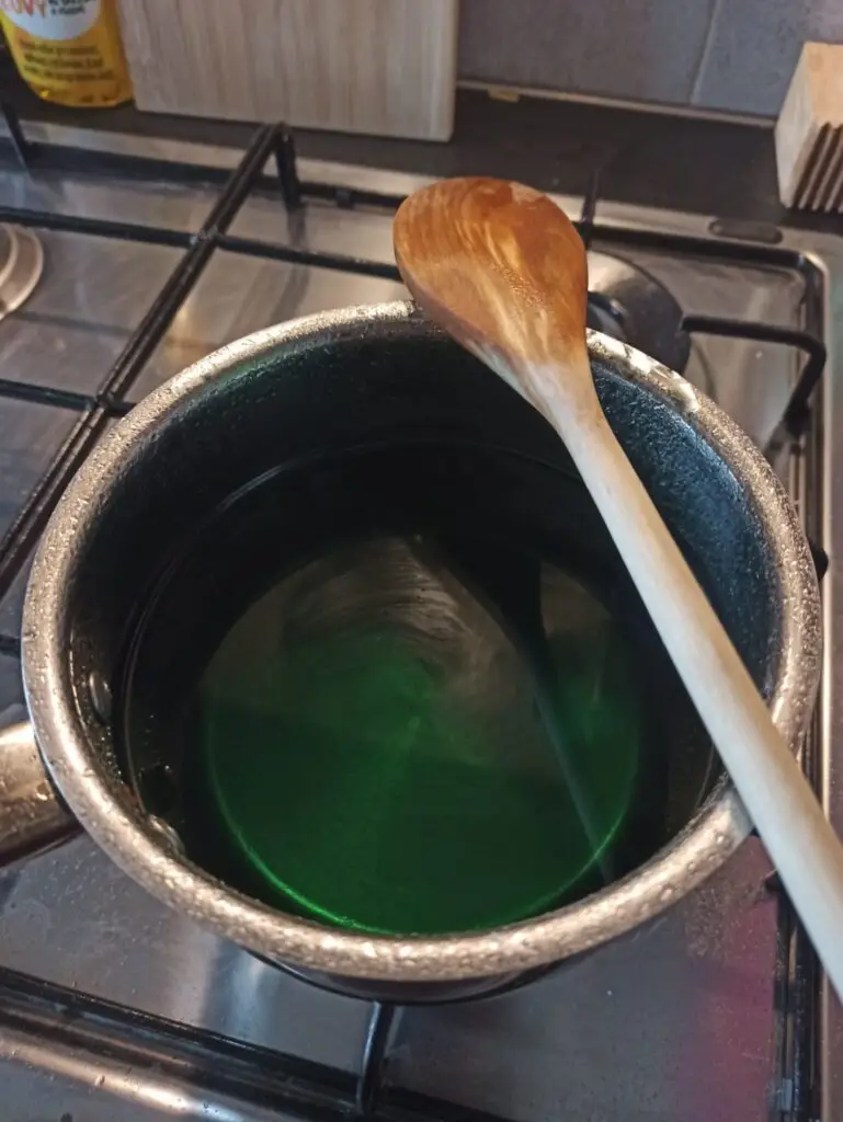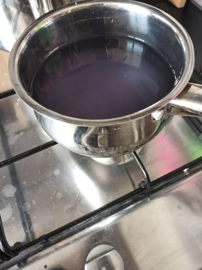 Užívala jsem si duhový koncert. Světle modrou vodu po přecedění. Petrolejovou barvu po rozpuštění půl kila cukru a 20 minutovém povaření. Přiblížil se mnou očekávaný nejoblíbenější bod. Přidání kyseliny citronové, která by měla sirupu dodat příjemnou kyselkavou chuť a onu pověstnou fialovou barvu.