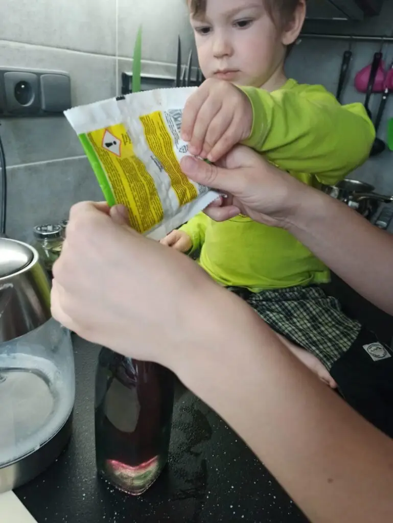 Na barevné divadlo jsem pozvala dvou a půl letého syna i manžela, coby fotografa onoho zázraku. Syn si ihned našel novou zálibu – bagrování kořenek a jejich obsahů. V zoufalství jsem jej nalákala na možnost vsypat tam onen činitel, který promění barvu, načež k rozsypanému koření přibyla i kyselina citronová. Dosypala jsem tam několik krystalků od oka a křičela na manžela, ať rychle fotí, aby sirup nezměnil barvu bez nás.
